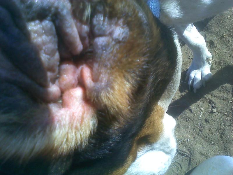 From the pictures of the outside of Ellie Mae’s ears, her ears look fairly normal, although they lack the softness you would expect from hound ear flaps. But when you lift her ear flaps as in the next picture, you see what is a “cauliflower” ear appearance, the result of inflamed cartilage and skin tissue that are an outgrowth from the inner ear infections that were never treated. However, the real problem lies further in her ears in what the vet has determined to be severe infections in both inner ear canals, with such swelling of the tissue within the ear canals that the infection cannot drain and is trapped, continuing to breed infection. Her constant ear-flapping is a sure sign that these infections are causing constant pain and discomfort and her only relief has been to shake her head to flap her ears to try to find some relief and to rub her ears on hard surfaces, causing more damage and harm to the delicate ear flap tissue.