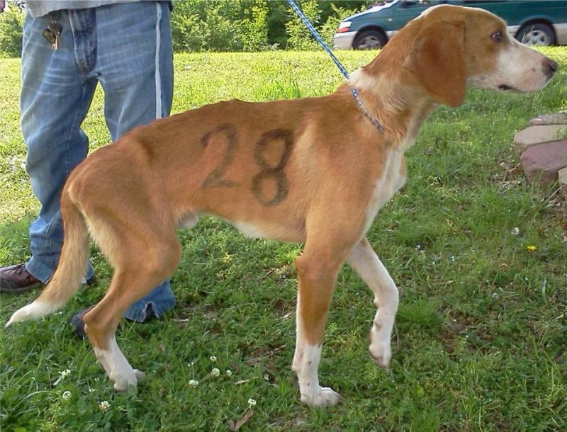 This is the story of #28, an emaciated foxhound mix who was running in the woods in SC, with an obvious broken hip and in severe pain. Many advocates of the shelter where he ended up, were desperate to find a rescue to take him so he would be saved and his hip could be repaired. The night before he was scheduled to be euthanized, one of our fosters stepped up so we could pull him and schedule his FHO surgery on his hip. Turns out he was an entrant in hunting competitions where numbers are marked on the dogs with dye and afterwards the dogs are abandoned or shot or killed int eh woods, his broken hip perhaps a result of an attempt by his owner to run him over with a car or truck.